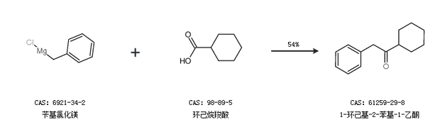 2.通過芐基氯化鎂和環(huán)己烷羧酸合成1-環(huán)己基-2-苯基-1-乙酮,收率約54%;