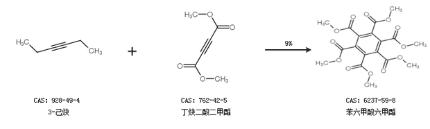 2.通過3-己炔和丁炔二酸二甲酯合成苯六甲酸六甲酯,收率約9%;