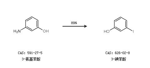 1.通過3-氨基苯酚合成3-碘苯酚,收率約89%;