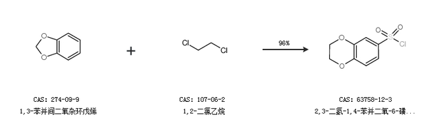 1.通過1,3-苯并間二氧雜環(huán)戊烯和1,2-二氯乙烷合成2,3-二氫-1,4-苯并二氧-6-磺酰氯,收率約96%;