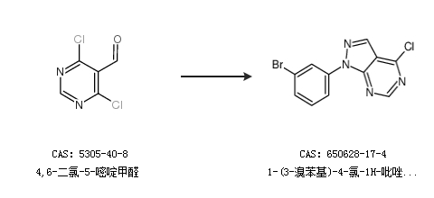 1.通過4,6-二氯-5-嘧啶甲醛合成1-(3-溴苯基)-4-氯-1H-吡唑并[3,4-d]嘧啶