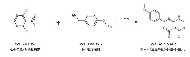 1.通過4,6-二氯-5-硝基嘧啶和4-甲氧基芐胺合成N-(4-甲氧基芐基)-6-氯-5-硝基嘧啶-4-胺,收率約78%;