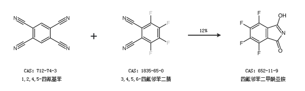 2.通過(guò)1,2,4,5-四氰基苯和3,4,5,6-四氟鄰苯二腈合成四氟鄰苯二甲酰亞胺,收率約12%;