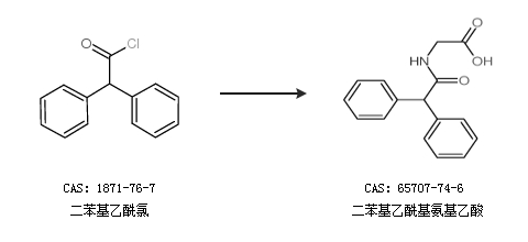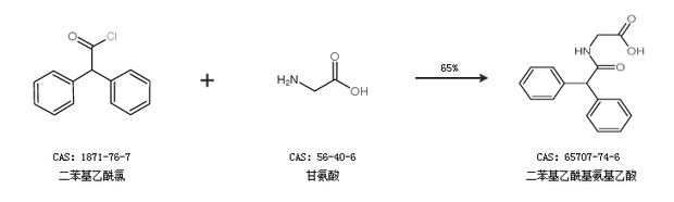 2.通過(guò)二苯基乙酰氯和甘氨酸合成二苯基乙?;被宜?,收率約65%;
