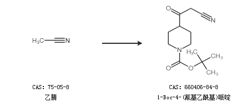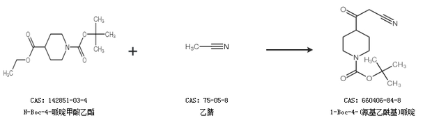 1.通過(guò)N-Boc-4-哌啶甲酸乙酯和乙腈合成1-Boc-4-(氰基乙酰基)哌啶