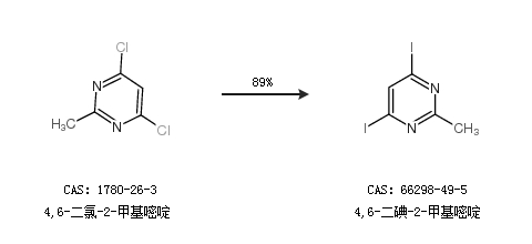 1.通過4,6-二氯-2-甲基嘧啶合成4,6-二碘-2-甲基嘧啶,收率約89%;