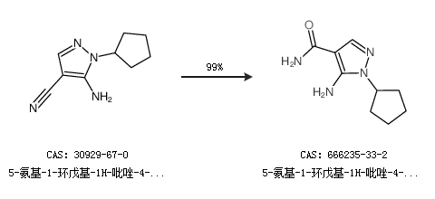 1.通過5-氨基-1-環(huán)戊基-1H-吡唑-4-甲腈合成5-氨基-1-環(huán)戊基-1H-吡唑-4-羧酰胺,收率約99%;