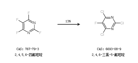 2.通過2,4,5,6-四氟嘧啶合成2,4,6-三氯-5-氟嘧啶,收率約13%;