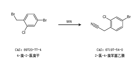 2.通過4-溴-2-氯溴芐合成2-氯-4-溴苯基乙腈,收率約98%;