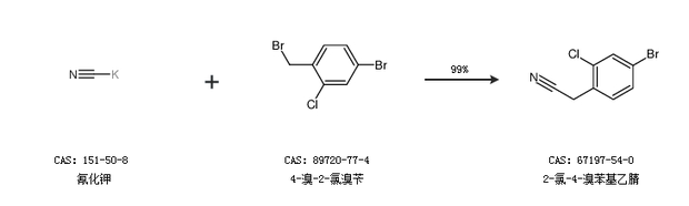 1.通過氰化鉀和4-溴-2-氯溴芐合成2-氯-4-溴苯基乙腈,收率約99%;