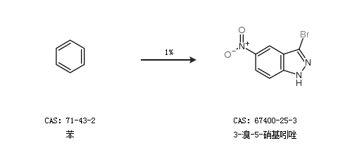 2.通過(guò)苯合成3-溴-5-硝基吲唑,收率約1%;