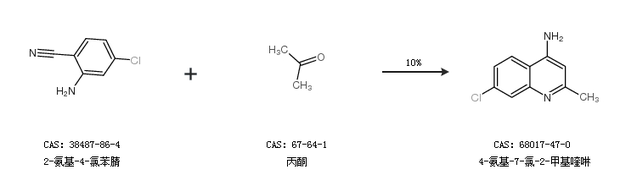 2.通過2-氨基-4-氯苯腈和丙酮合成4-氨基-7-氯-2-甲基喹啉,收率約10%;