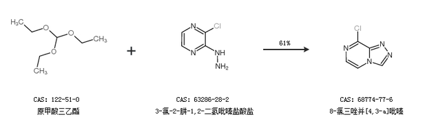 1.通過原甲酸三乙酯和3-氯-2-肼-1,2-二氫吡嗪鹽酸鹽合成8-氯三唑并[4,3-a]吡嗪,收率約61%;
