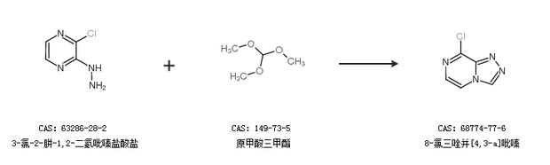 2.通過3-氯-2-肼-1,2-二氫吡嗪鹽酸鹽和原甲酸三甲酯合成8-氯三唑并[4,3-a]吡嗪