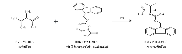 2.通過L-纈氨酸和9-芴甲基-N-琥珀酰亞胺基碳酸酯合成Fmoc-L-纈氨酸,收率約86%;