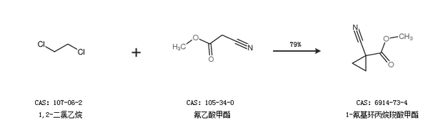 1.通過二溴乙烷和氰乙酸甲酯合成1-氰基環(huán)丙烷羧酸甲酯,收率約94%;
