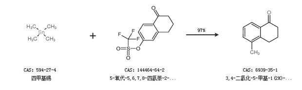 1.通過四甲基錫和5-氧代-5,6,7,8-四氫萘-2-基 三氟甲烷磺酸合成3,4-二氫化-5-甲基-1(2H)-萘酮,收率約97%;