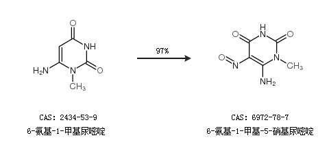 1.通過6-氨基-1-甲基尿嘧啶合成6-氨基-1-甲基-5-硝基尿嘧啶,收率約97%;