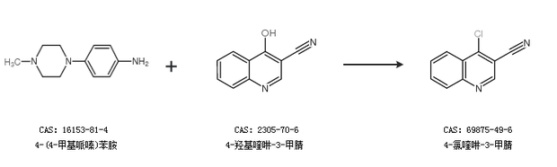 2.通過(guò)4-(4-甲基哌嗪)苯胺和4-羥基喹啉-3-甲腈合成4-氯喹啉-3-甲腈