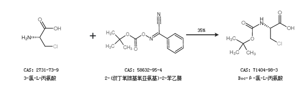2.通過3-氯-L-丙氨酸和2-(叔丁氧羰基氧亞氨基)-2-苯乙腈合成Boc-β-氯-L-丙氨酸,收率約35%;