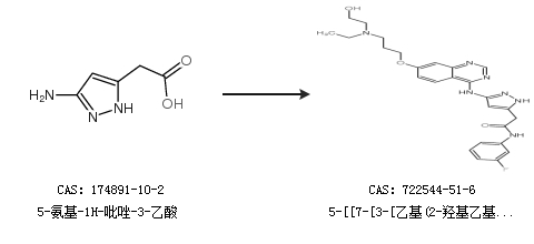 2.通過(guò)5-氨基-1H-吡唑-3-乙酸合成5-[[7-[3-[乙基(2-羥基乙基)氨基]丙氧基]-4-喹唑啉]氨基]-N-(3-氟苯基)-1H-吡唑-3-乙酰胺