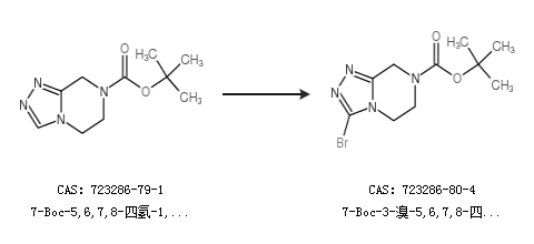 1.通過(guò)7-Boc-5,6,7,8-四氫-1,2,4-三唑并[4,3-a]吡嗪合成7-Boc-3-溴-5,6,7,8-四氫-1,2,4-三唑并[4,3-a]吡嗪
