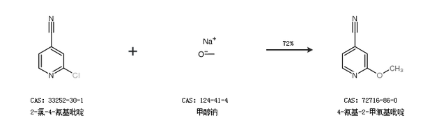 1.通過(guò)2-氯-4-氰基吡啶和甲醇鈉合成4-氰基-2-甲氧基吡啶,收率約72%;