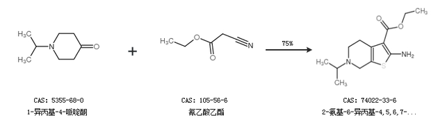1.通過1-異丙基-4-哌啶酮和氰乙酸乙酯合成2-氨基-6-異丙基-4,5,6,7-四氫噻吩并-[2,3-c]吡啶-3-羧酸乙酯,收率約75%;