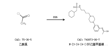 1.通過乙酰氯合成N-[3-[4-[4-[(環(huán)己基甲基磺?;?氨基]丁基]哌嗪-1-基]苯基]乙酰胺,收率約89%;