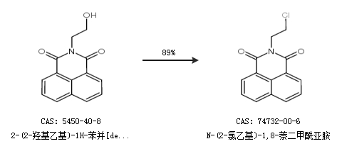 1.通過(guò)2-(2-羥基乙基)-1H-苯并[de]異喹啉-1,3(2H-)-二酮合成N-(2-氯乙基)-1,8-萘二甲酰亞胺,收率約89%;