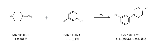 1.通過N-甲基哌嗪和1,3-二溴苯合成1-(3-溴苯基)-4-甲基-哌嗪,收率約77%;