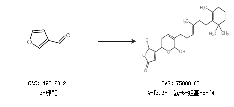 2.通過(guò)3-糠醛合成4-[3,6-二氫-6-羥基-5-[4-甲基-6-(2,6,6-三甲基-1-環(huán)己烯-1-基)-3-己烯基]-2H-吡喃-2-基]-5-羥基-2(5H)-呋喃酮