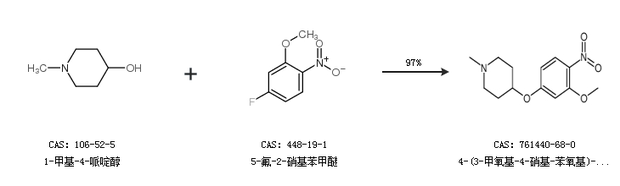 1.通過1-甲基-4-哌啶醇和5-氟-2-硝基苯甲醚合成4-(3-甲氧基-4-硝基-苯氧基)-1-甲基-哌啶,收率約97%;