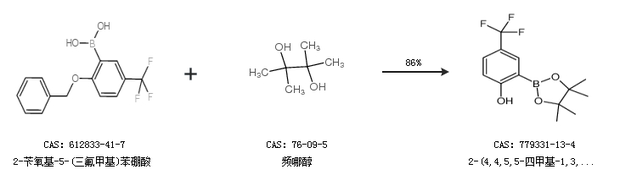 1.通過2-芐氧基-5-(三氟甲基)苯硼酸和頻哪醇合成2-(4,4,5,5-四甲基-1,3,2-二噁硼烷-2-基)-4-(三氟甲基)苯酚,收率約86%;