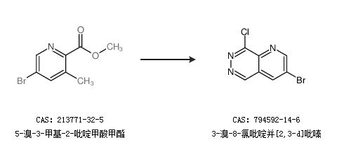 2.通過(guò)5-溴-3-甲基-2-吡啶甲酸甲酯合成3-溴-8-氯吡啶并[2,3-d]吡嗪
