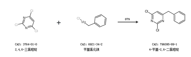 1.通過2,4,6-三氯嘧啶和芐基氯化鎂合成4-芐基-2,6-二氯嘧啶,收率約87%;