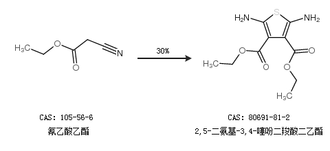 1.通過氰乙酸乙酯合成2,5-二氨基-3,4-噻吩二羧酸二乙酯,收率約30%;
