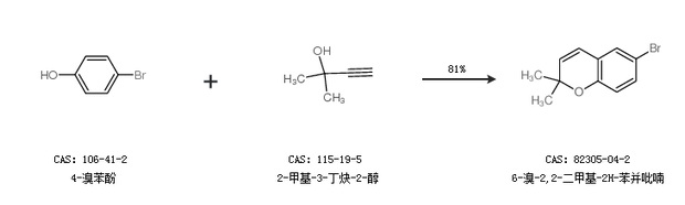 1.通過(guò)4-溴苯酚和2-甲基-3-丁炔-2-醇合成6-溴-2,2-二甲基-2H-苯并吡喃,收率約81%;