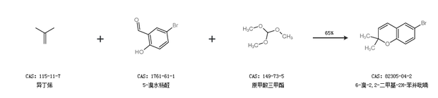 2.通過(guò)異丁烯、5-溴水楊醛和原甲酸三甲酯合成6-溴-2,2-二甲基-2H-苯并吡喃,收率約65%;