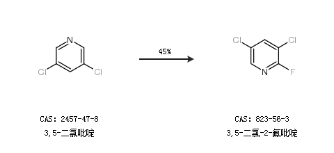 2.通過3,5-二氯吡啶合成3,5-二氯-2-氟吡啶,收率約45%;