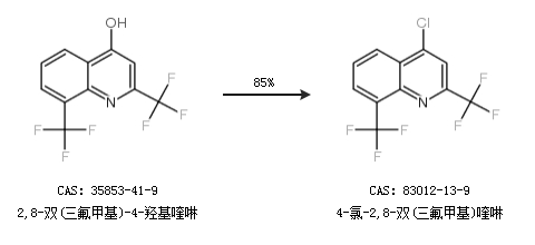 1.通過2,8-雙(三氟甲基)-4-羥基喹啉合成4-氯-2,8-雙(三氟甲基)喹啉,收率約85%;
