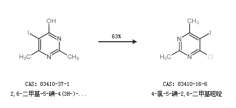1.通過2,6-二甲基-5-碘-4(3H-)-嘧啶酮合成4-氯-5-碘-2,6-二甲基嘧啶,收率約63%;