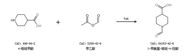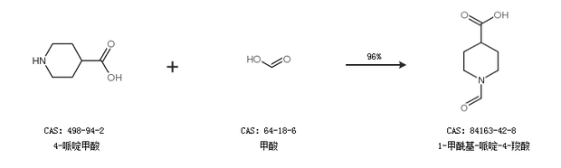 1.通過4-哌啶甲酸和甲酸合成1-甲?;?哌啶-4-羧酸,收率約96%;