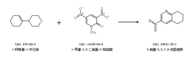 1.通過1-嗎啉基-1-環(huán)己烯和1-甲基-3,5-二硝基-2-吡啶酮合成3-硝基-5,6,7,8-四氫喹啉