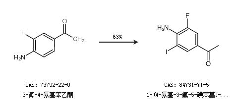 1.通過3-氟-4-氨基苯乙酮合成1-(4-氨基-3-氟-5-碘苯基)-1-乙酮,收率約63%;