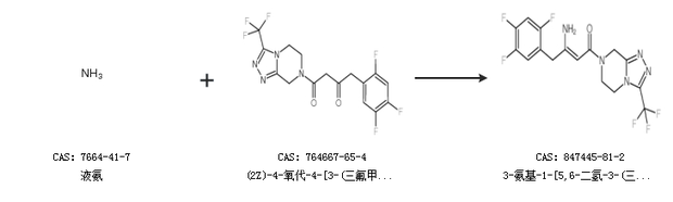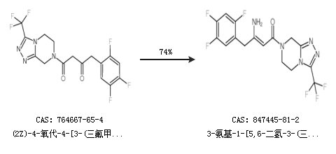 2.通過(guò)液氨和(2Z)-4-氧代-4-[3-(三氟甲基)-5,6-二氫-[1,2,4]三唑并[4,3-a]吡嗪-7-(8H)-基]-1-(2,4,5-三氟苯基)丁-2-酮合成3-氨基-1-[5,6-二氫-3-(三氟甲基)-1,2,4-噻唑并[4,3-a]吡嗪-7(8H)-基]-4-(2,4,5-三氟苯基)-2-丁烯-1-酮