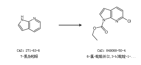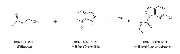 1.通過氯甲酸乙酯和7-氮雜吲哚-7-氧化物合成6-氯-吡咯并[2,3-b]吡啶-1-羧酸乙酯,收率約69%;