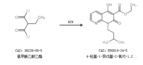 1.通過氯甲酰乙酸乙酯合成4-羥基-1-異戊基-2-氧代-1,2-二氫-1,8-萘啶-3-羧酸乙酯,收率約42%;