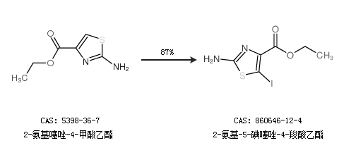 1.通過(guò)2-氨基噻唑-4-甲酸乙酯合成2-氨基-5-碘噻唑-4-羧酸乙酯,收率約87%;
