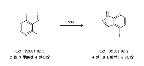 1.通過2-氟-3-甲?;?4-碘吡啶合成4-碘-1H-吡唑并3,4-b吡啶,收率約93%;